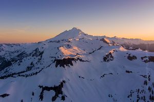 An aerial view of Mount Baker glowing in the soft golden light of sunset above the snow-covered ridges of Table Mountain. The evening sun casts warm hues across the icy landscape, contrasting with the deep blue shadows of the North Cascades. Captured by Mike Reid Photography, this fine art aerial image captures the quiet grandeur and delicate tones of twilight high above Washington’s alpine wilderness.