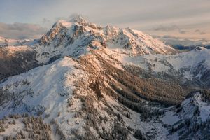 An aerial perspective of Mount Shuksan and the rugged sweep of Shuksan Arm glowing in warm afternoon light. Captured from high above the North Cascades, this fine art drone photograph by Mike Reid Photography showcases the mountain’s dramatic ridges and snow-covered forests under a soft golden sky.