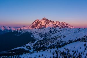 A magnificent aerial photograph of Mount Shuksan glowing under the warm hues of sunset in Washington’s North Cascades. The alpenglow paints the snow-covered slopes in radiant pink and purple tones as the day fades into twilight. Captured by Mike Reid Photography, this fine art drone image showcases the timeless beauty and grandeur of one of the Pacific Northwest’s most iconic peaks bathed in evening light.