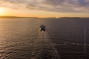 A drone captures the Mukilteo ferry making its crossing to Whidbey Island beneath a glowing Pacific Northwest sunset. The warm evening light reflects across the rippled waters of Puget Sound, creating a stunning aerial composition of motion and tranquility. This fine art photograph highlights the beauty of Washington’s ferry system and coastal landscape — perfect for collectors, décor, or commercial licensing. Captured by Mike Reid Photography.