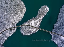 An overhead aerial view of Deception Pass Bridge blanketed in winter snow, connecting the forested cliffs and islands above the turquoise waters of the Salish Sea. Captured after a rare coastal snowfall, this fine art drone photograph highlights the geometric beauty of the bridge’s curve against the organic shapes of the islands. A striking perspective on one of Washington State’s most iconic landmarks — perfect for fine art collectors, modern wall décor, or commercial licensing. Captured by Mike Reid Photography.