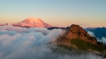 A breathtaking Pacific Northwest aerial capturing Mount Rainier and Yakima Peak rising above a sea of morning fog at sunrise. The first light paints Rainier’s glacier slopes in soft alpenglow while the rugged cliffs of Yakima Peak catch the golden tones of dawn. This fine art aerial photograph beautifully illustrates the serenity and grandeur of Washington’s Cascade Range. Perfect for collectors, wall art, or licensing. Captured by Mike Reid Photography.