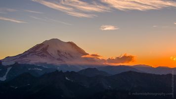 An awe-inspiring aerial view of Mount Rainier silhouetted against a fiery Pacific Northwest sunset. Layers of alpine ridges fade into the distance as glowing orange and magenta clouds drift across the horizon. Captured high above Washington’s Cascade Range, this fine art photograph reveals the dramatic beauty and timeless majesty of Rainier at day’s end. Ideal for fine art collectors, wall décor, or commercial licensing. Captured by Mike Reid Photography.