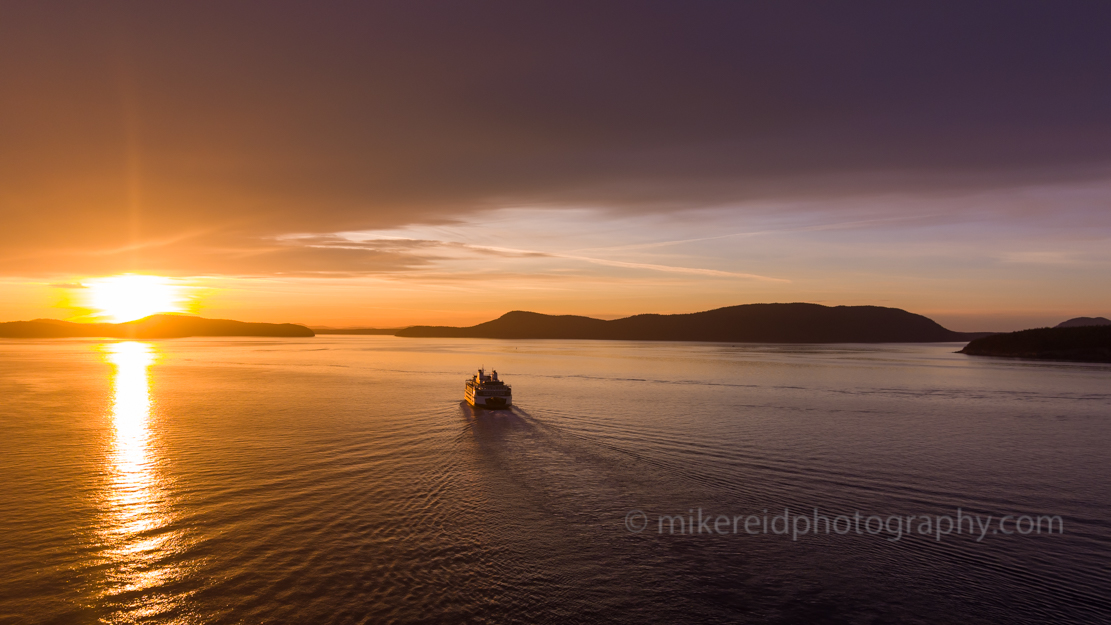 A drone captures a stunning aerial view of a Washington State ferry gliding toward the San Juan Islands beneath a glowing sunrise. The golden light of dawn reflects off the calm waters of the Salish Sea, framed by the silhouetted islands of the Pacific Northwest. This fine art aerial photograph evokes the serenity and freedom of island travel — ideal for collectors, wall décor, or commercial licensing. Captured by Mike Reid Photography.