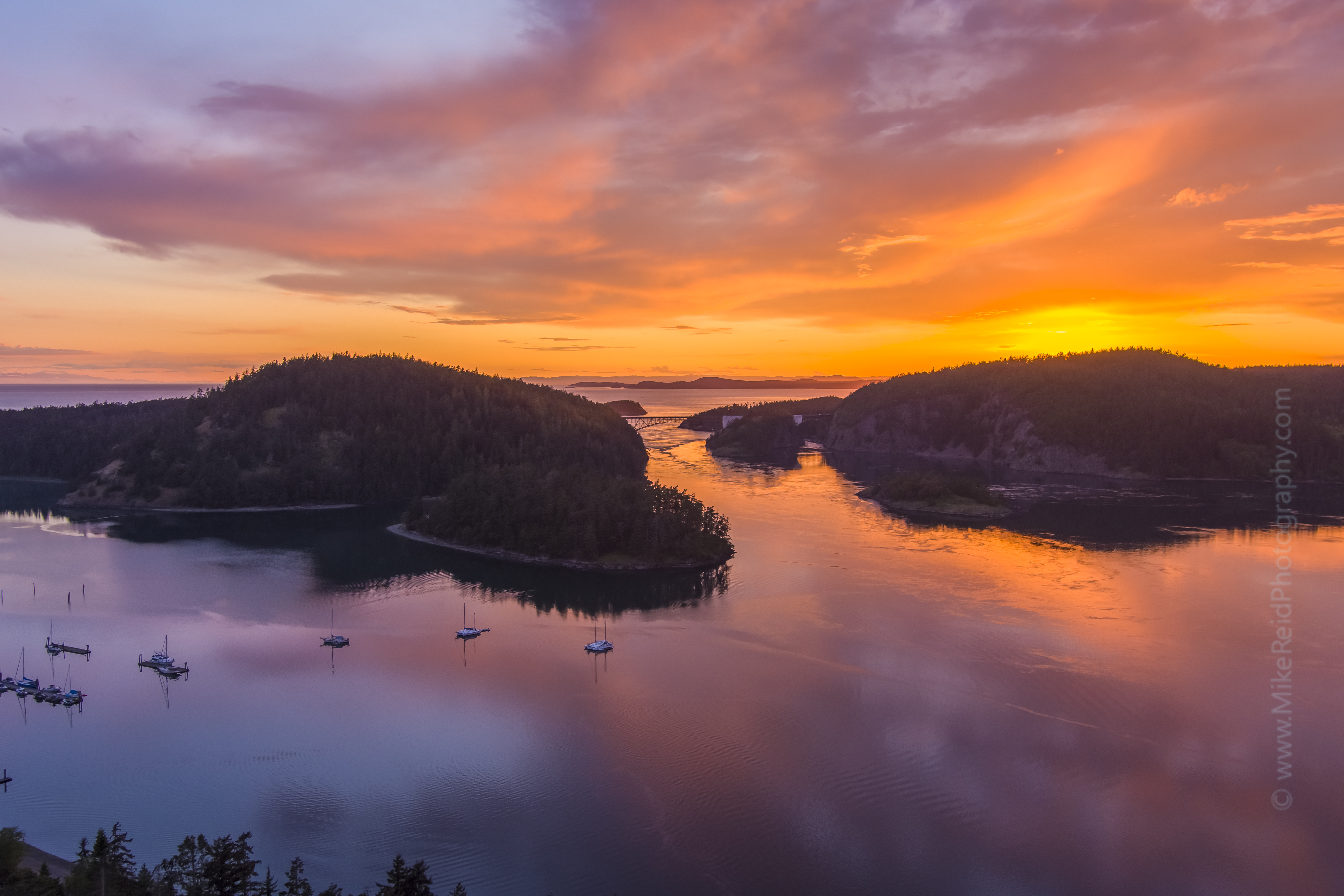 A breathtaking aerial view captures the sunset over Deception Pass Bridge connecting Whidbey Island and Fidalgo Island in Washington State. The glowing sky reflects in the still waters below, illuminating the rugged coastline and forested islands of the Pacific Northwest. This fine art drone photograph showcases one of Washington’s most iconic landscapes — perfect for collectors, wall décor, or commercial licensing. Captured by Mike Reid Photography.