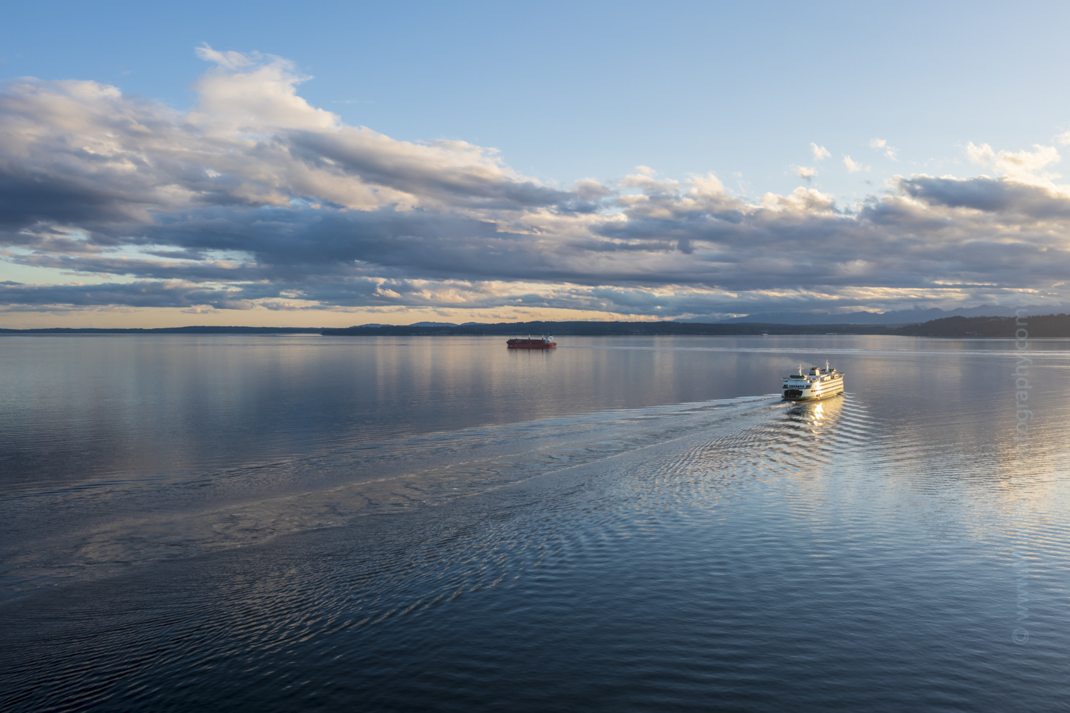 An aerial perspective captures the Edmonds to Kingston ferry gliding across the calm waters of Puget Sound under soft evening light. The wake of the boat ripples through the tranquil surface as distant clouds drift above the Olympic Mountains and horizon. This fine art aerial photograph beautifully showcases the serenity and symmetry of Pacific Northwest maritime life — perfect for collectors, décor, or commercial licensing. Captured by Mike Reid Photography.