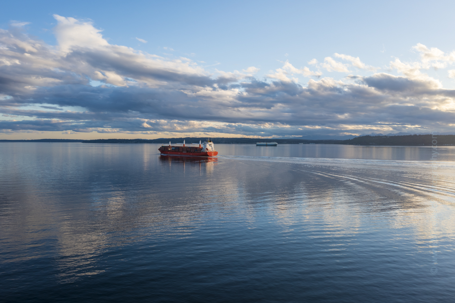 A red cargo ship glides gracefully across the calm waters of Puget Sound, part of the greater Salish Sea, beneath a dramatic Pacific Northwest sky. The late afternoon light paints the surface in soft blues and reflections, capturing the quiet strength and motion of maritime trade in Washington’s inland sea. This fine art photograph blends tranquility and industry, perfect for collectors, décor, or commercial licensing. Captured by Mike Reid Photography.