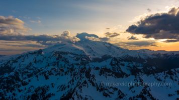 A dramatic aerial view of Mount Rainier at sunset, as golden light spills across the snow-covered ridges and peaks of the Cascade Mountains. Clouds swirl around the summit, glowing with warmth against the fading evening sky. Captured by Mike Reid Photography, this fine art aerial image embodies the grandeur and serenity of the Pacific Northwest landscape — a perfect piece for collectors, nature lovers, or fine art wall décor.