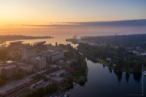 An elevated sunrise view over Seattle’s Montlake Cut and the University of Washington campus, with Husky Stadium glowing in soft morning light. The still waters of the canal reflect the golden hues of dawn as Lake Washington stretches into the distance. Captured by Mike Reid, this fine-art aerial photograph celebrates the peaceful beauty of Seattle’s waterways and iconic architecture.