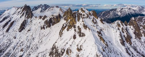 A breathtaking aerial panorama of Kangaroo Ridge near Washington Pass, blanketed in fresh winter snow beneath a crisp blue sky. The dramatic granite peaks and rugged alpine formations of the North Cascades rise in sharp contrast to the soft snowfields below. Captured by Mike Reid Photography, this fine art aerial image reveals the wild beauty and remote grandeur of Washington’s mountain wilderness — a stunning addition to any nature or adventure art collection.