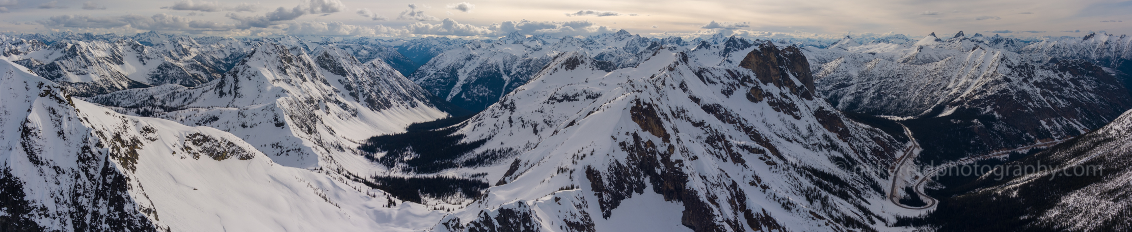 A sweeping aerial panorama over the North Cascades featuring Silver Star Mountain, Kangaroo Peak, and Liberty Bell framed in snow-covered grandeur. The rugged spires and deep alpine valleys unfold beneath a soft winter sky, capturing the wild heart of Washington’s mountain wilderness. Photographed by Mike Reid Photography, this fine art aerial image celebrates the breathtaking scale and majesty of the Cascade Range — a striking addition to any mountain or nature-inspired art collection.