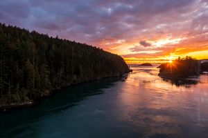 A radiant sunset lights up Deception Pass Bridge, its golden rays reflecting across the calm waters between Whidbey Island and Fidalgo Island. The scene captures the timeless beauty of Washington’s coastal wilderness — towering evergreens, glowing sky, and tranquil currents flowing beneath the bridge. This fine art photograph embodies the magic of Pacific Northwest evenings, perfect for wall décor, collectors, or commercial licensing. Captured by Mike Reid Photography.