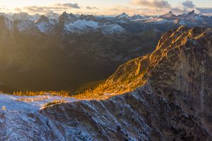 Golden sunset light sweeps across snow-dusted ridges and glowing alpine larches near Washington Pass in Washington’s North Cascades. Captured by Mike Reid Photography, this aerial fine art image highlights the fleeting radiance of autumn as the day’s last light illuminates the rugged granite landscape. A stunning tribute to the Pacific Northwest’s mountain beauty and changing seasons, perfect for collectors of aerial landscape photography.
