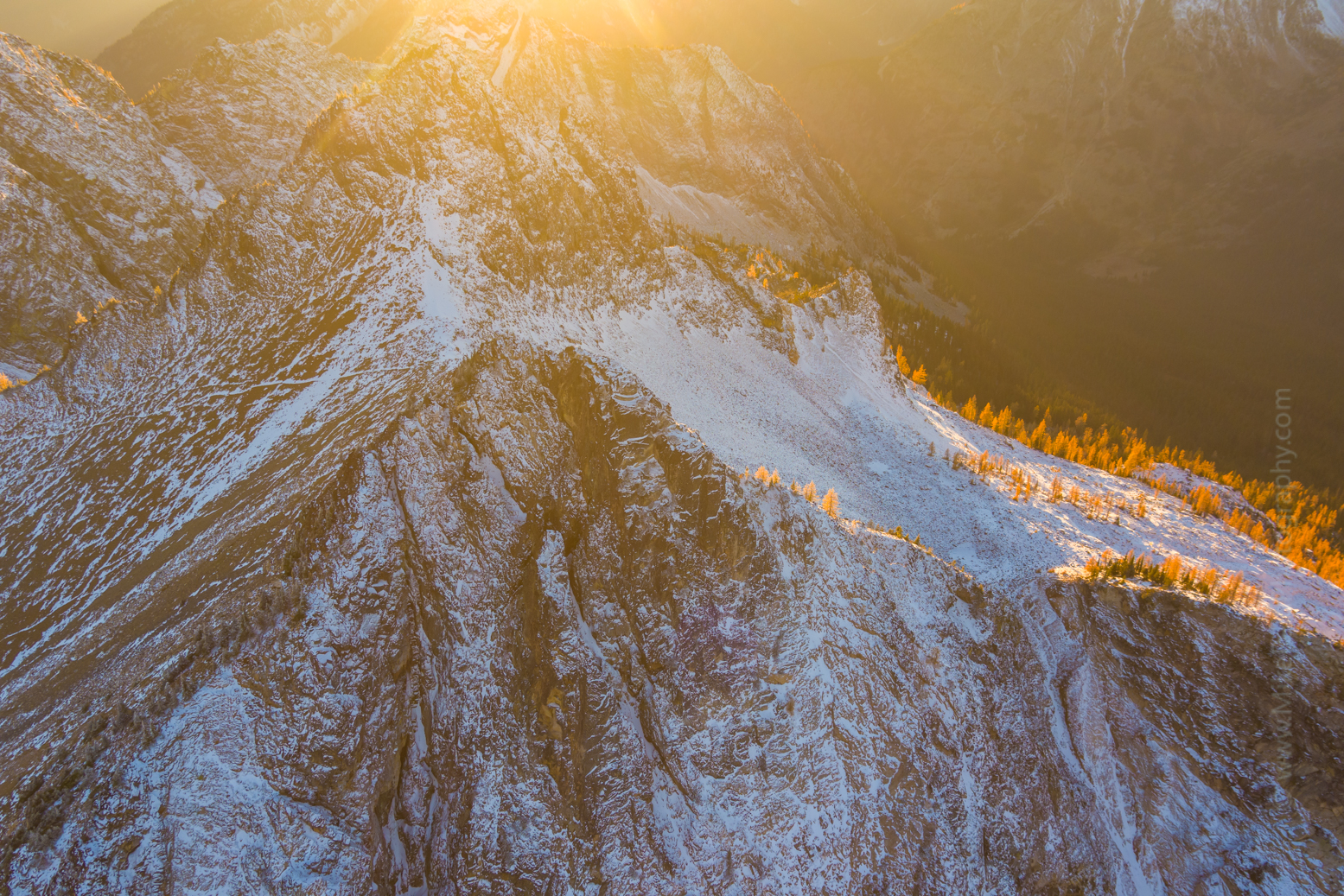 Aerial view of the North Cascades bathed in golden sunset light as alpine larches glow along snow-covered ridges. Captured by Mike Reid Photography, this fine art aerial photograph reveals the stunning contrast of warm light against rugged granite peaks and frosty autumn slopes near Washington Pass. A serene and timeless celebration of the Pacific Northwest’s mountain beauty.