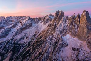 Soft sunrise light paints Liberty Bell and the Early Winters Spires in warm alpine hues above Washington Pass in the North Cascades. Captured from the air by Mike Reid Photography, this breathtaking aerial reveals the intricate textures of the granite peaks dusted with early snow, set against a serene pink and blue dawn sky. A fine art aerial print celebrating the rugged beauty and calm grandeur of Washington’s alpine wilderness.