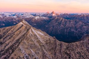 A breathtaking aerial sunrise over Golden Horn in Washington’s North Cascades. The first light of dawn brushes the rugged peaks with pink and gold hues, illuminating snow-dusted ridges under a pastel sky. Captured by Mike Reid Photography, this fine art drone image reveals the serenity and grandeur of the Pacific Northwest alpine wilderness at daybreak.