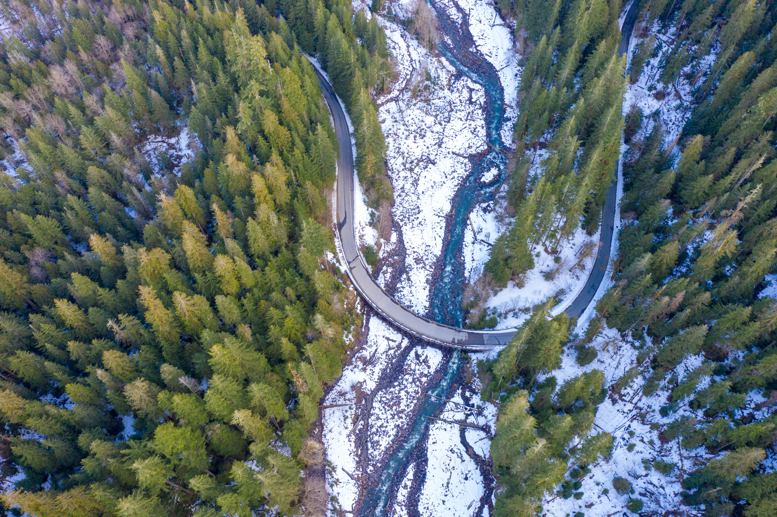A striking aerial view over Washington’s Baker Lake Road, where a winding forest road and icy blue river cut through snow-dusted evergreens in the North Cascades. Captured by Mike Reid, this fine-art drone photograph highlights the textures and colors of the Pacific Northwest wilderness from above — a blend of rugged nature and serene winter beauty.