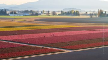 A stunning aerial view over the Skagit Valley tulip fields in Washington State, captured in the soft golden light of morning. Rows of vibrant red, pink, and yellow tulips stretch across the valley floor with misty farmland and foothills beyond. Photographed by Mike Reid, this fine-art image captures the color and calm of springtime in the Pacific Northwest.