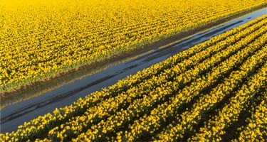 A close aerial view of daffodil rows in full bloom across Washington’s Skagit Valley, their golden petals glowing under spring light. The irrigation channel reflects the sky, adding a serene contrast to the vivid fields. Captured by Mike Reid, this fine-art drone photograph celebrates the color, symmetry, and vitality of the Pacific Northwest’s springtime farmlands.