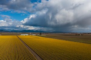 Golden daffodil fields stretch across Skagit Valley as a dramatic rain squall passes over the distant foothills. The contrast of sunlight and shadow reveals the Pacific Northwest’s ever-changing spring weather. Captured by Mike Reid, this fine-art aerial photograph blends vibrant floral color with the power and mood of Washington’s dynamic skies.