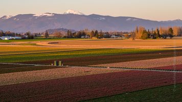 Soft golden light settles over the tulip fields of Skagit Valley, Washington, as Mount Baker rises in the distance beneath a tranquil evening sky. The warm glow of sunset enhances the vibrant rows of spring blooms in this fine-art landscape by Mike Reid. A peaceful, timeless view capturing the color and calm of the Pacific Northwest at dusk.