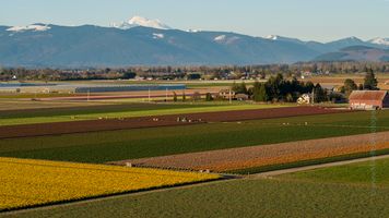 Vibrant spring fields stretch across Skagit Valley, Washington, leading the eye toward snow-capped Mount Baker under soft evening light. Captured by Mike Reid, this fine-art landscape highlights the rich colors and harmony of farmland and mountain scenery in the Pacific Northwest — a timeless view of spring’s renewal.