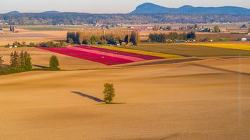 A solitary tree stands among the golden farmland of Skagit Valley as brilliant rows of red, pink, and yellow tulips stretch across the spring landscape beyond. Captured by Mike Reid, this fine-art photograph blends simplicity and vibrance, showcasing the unique beauty of Washington’s tulip country from above.