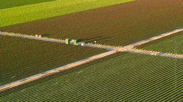 An aerial view of intersecting roads through Skagit Valley’s colorful tulip fields in early spring. The repeating rows of flowers form striking geometric patterns, illuminated by soft evening light. Captured by Mike Reid, this fine-art photograph highlights the precision and beauty of Washington’s tulip country from above.