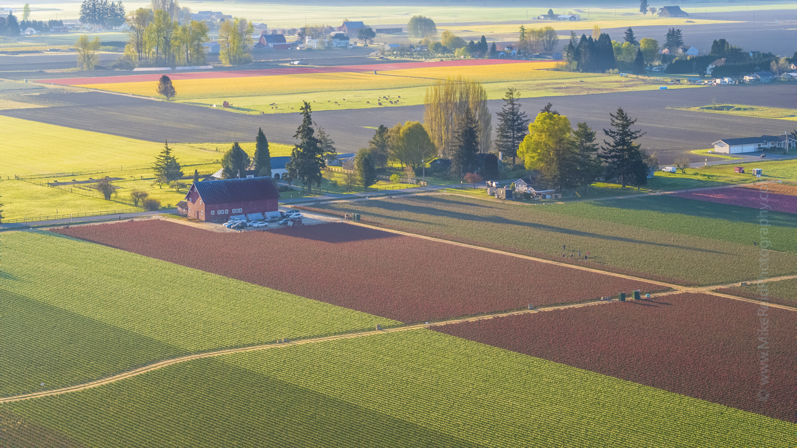Soft morning sunlight warms the colorful tulip fields and classic red barn of Skagit Valley, Washington. Mist lingers in the distance as spring unfolds across the farmland. Captured by Mike Reid, this fine-art aerial landscape reveals the quiet geometry, glowing tones, and timeless charm of the Pacific Northwest in bloom.
