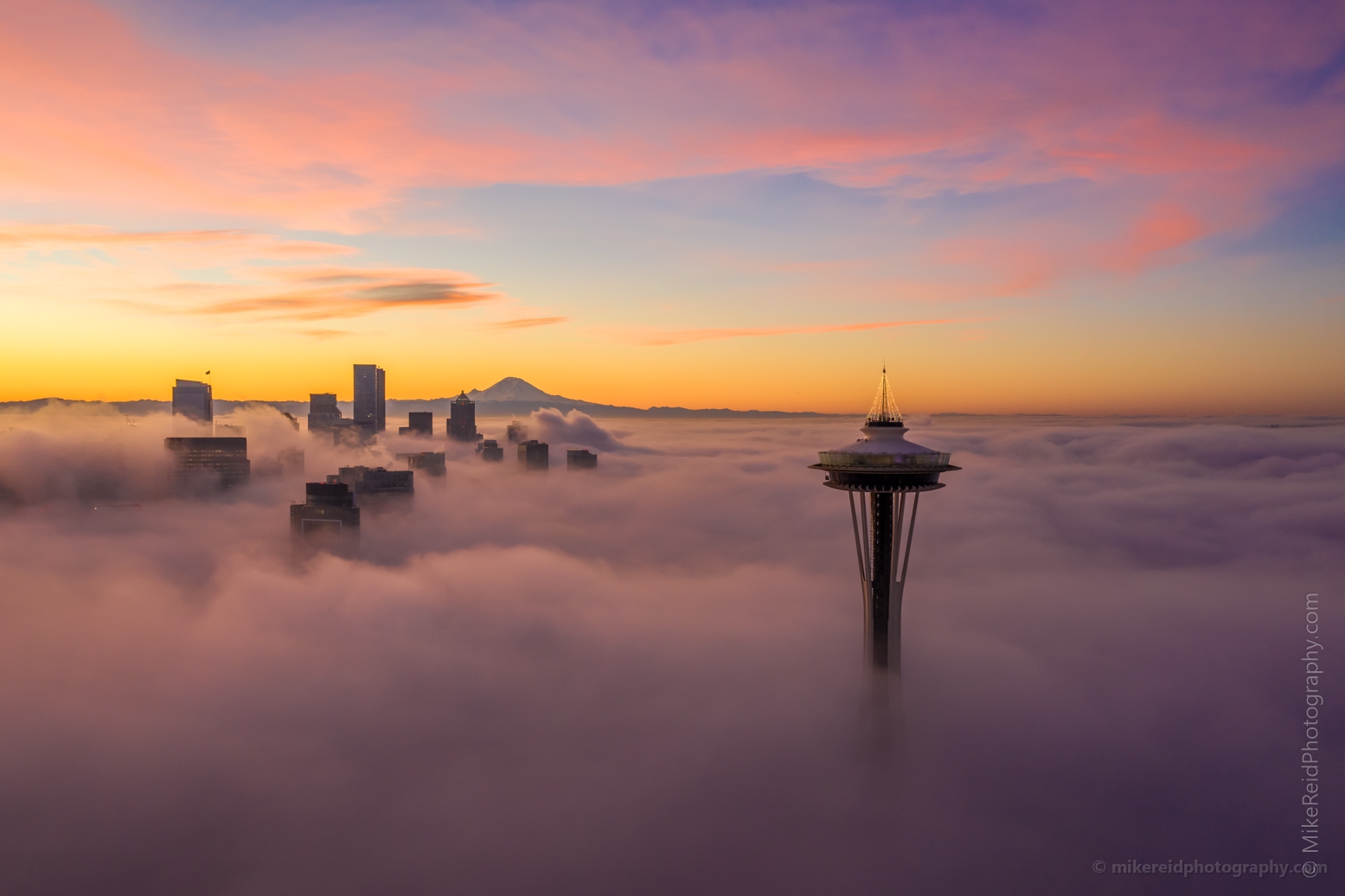 Over Seattle City and Space Needle at Sunrise Above the Clouds Aerial views over Seattle and surroundings in these unique video and photographic perspectives. To arrange a custom Seattle aerial photography tour, please contacct me.