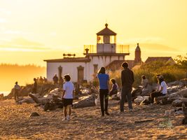 Captured with the Fujifilm GF500mm lens, this warm evening scene at Discovery Park glows with golden light as people gather along the beach beneath the historic lighthouse. The late-day sun casts long, soft shadows across the sand, creating a nostalgic summer atmosphere along Seattle’s western edge overlooking Puget Sound.