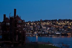 Historic Gas Works Park towers at dusk overlooking Lake Union and the illuminated homes of Seattle’s Eastlake and Capitol Hill neighborhoods under a deep blue evening sky.