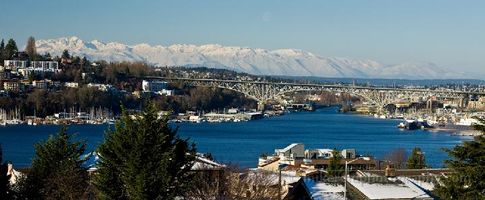 View of Seattle’s Aurora Bridge spanning the Lake Union Ship Canal with the Olympic Mountains in the distance, dusted with the season’s first snow under clear winter light.