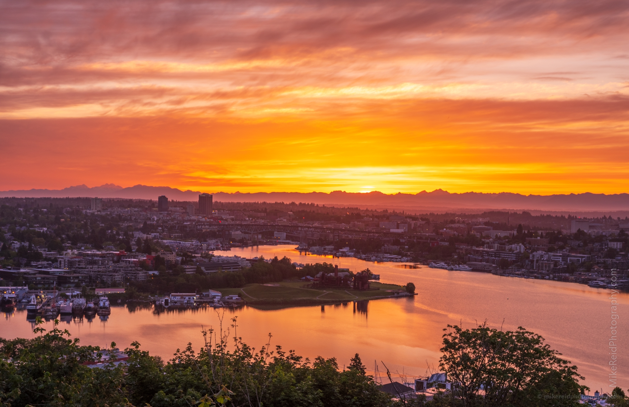 Brilliant orange sunrise over Lake Union seen from Queen Anne Hill in Seattle, with the University District and Gas Works Park reflecting in the calm morning water.