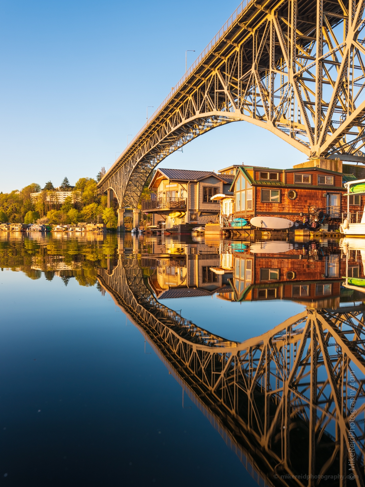 Vertical view of Seattle’s Aurora Bridge and colorful Lake Union houseboats reflected symmetrically in calm morning water under golden sunlight.