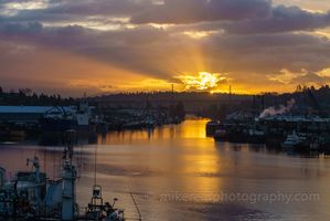 Golden sunrise over Seattle’s Lake Washington Ship Canal with fishing vessels and the Fremont Bridge silhouetted against radiant morning light and clouds.