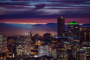 A dreamy close-up view of Seattle at sunrise as morning fog rolls gracefully over Capitol Hill and Eastlake. The city’s buildings glow softly beneath a dramatic sky of purple and magenta hues, blending urban texture with natural atmosphere. Layers of fog drift between the hills, creating a moody and ethereal Pacific Northwest moment.
