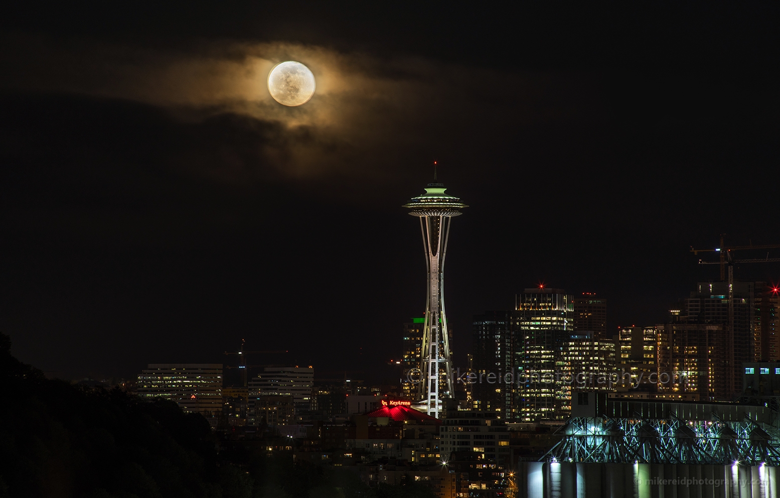A mesmerizing Seattle night scene capturing the full moon rising above the Space Needle. Soft clouds drift across the glowing moon as the city skyline sparkles below, creating a dramatic and moody Pacific Northwest moment. The interplay of moonlight and city light gives this image a timeless, cinematic feel.