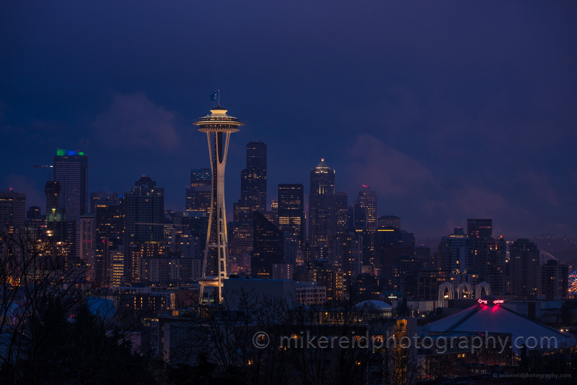 A dramatic nighttime view of Seattle’s skyline featuring the Space Needle proudly flying the Seahawks flag above the glowing downtown lights. Captured from Kerry Park, this image highlights the city’s vibrant spirit as deep blue twilight settles over the Pacific Northwest.