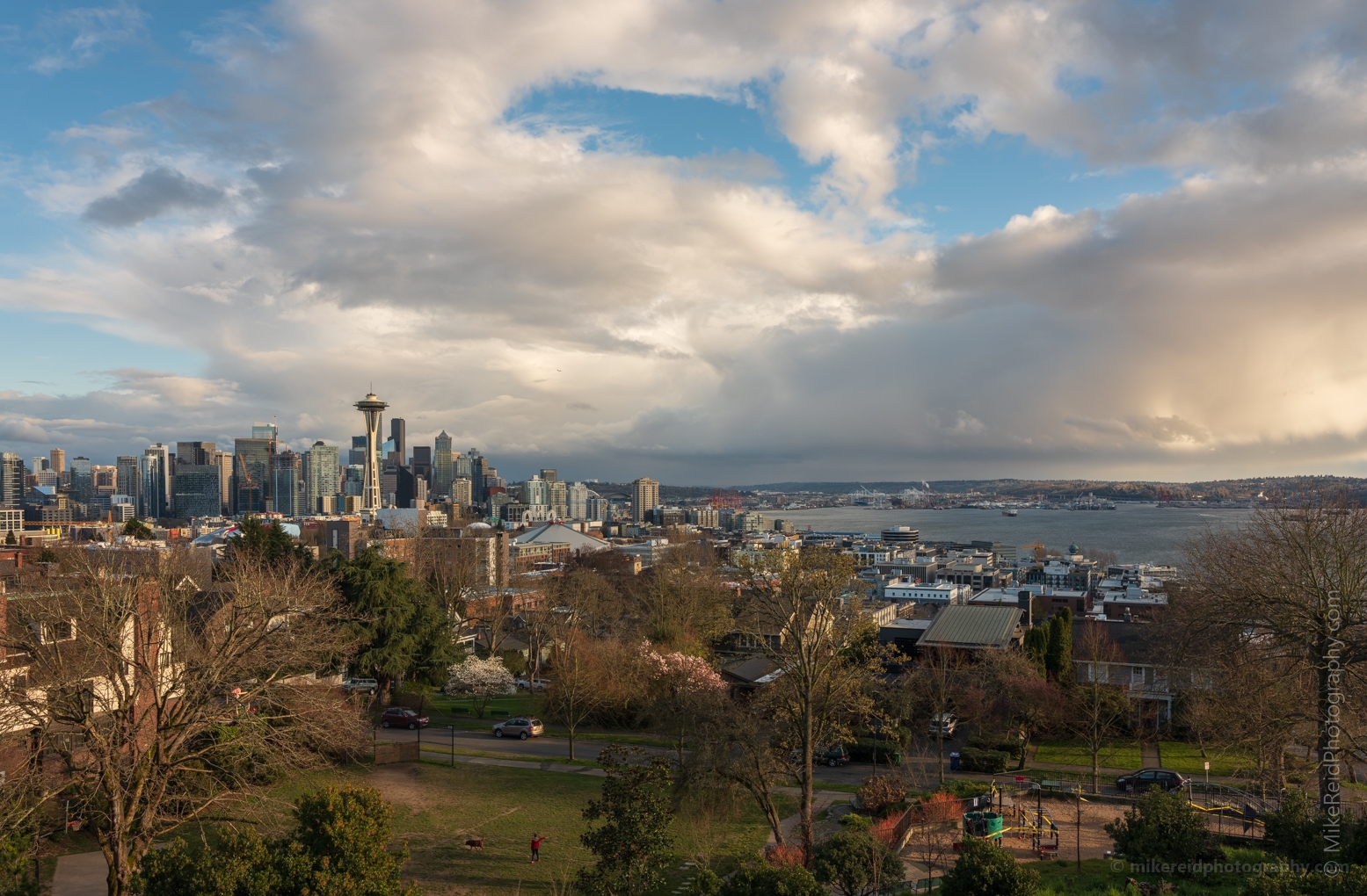 A striking daylight view of Seattle from Kerry Park as dramatic storm clouds sweep across the sky. The Space Needle rises above the city while sunlight breaks through, illuminating the skyline and shimmering waters of Elliott Bay.