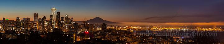 A radiant January sunrise over Seattle captured from Kerry Park, featuring the Space Needle illuminated against a glowing downtown skyline. Mount Rainier rises majestically beyond the city while the lights of the Port of Seattle shimmer across Elliott Bay.