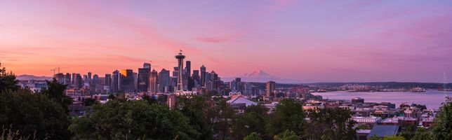A serene late sunrise panoramic view from Kerry Park showcasing Seattle’s skyline bathed in soft pink and lavender light. The Space Needle stands tall against the glowing downtown, with Mount Rainier illuminated in the distance beneath pastel skies.