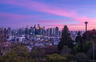 A gentle pastel sunrise bathes the Seattle skyline in hues of pink, lavender, and soft blue in this serene view from Bhy Kracke Park. The Space Needle glows in the early morning light as the city awakens beneath painted skies.
