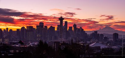 The vibrant colors of sunrise gently fade into soft morning light over the Seattle skyline in this peaceful view from Kerry Park. The Space Needle stands proudly against the golden horizon, while Mount Rainier glows faintly in the distance beneath layered pastel clouds.