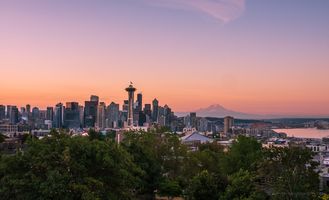 A gentle pastel sunrise washes over Seattle in this tranquil morning view from Kerry Park. The Space Needle and downtown skyline glow softly beneath a peach and lavender sky, while Mount Rainier rests quietly in the distance. The calm tones and early light create a serene, dreamlike mood that captures the peaceful side of the Pacific Northwest.