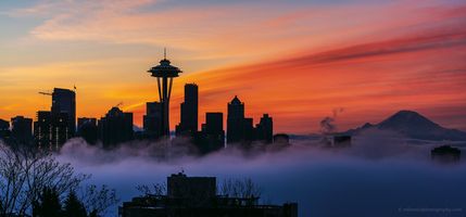 Seattle skyline at sunrise above the fog from Kerry Park. A stunning sunrise over Seattle captured from Kerry Park, with the Space Needle and downtown skyline rising above a thick layer of morning fog. Mount Rainier looms majestically in the distance as warm hues of orange and magenta paint the sky.