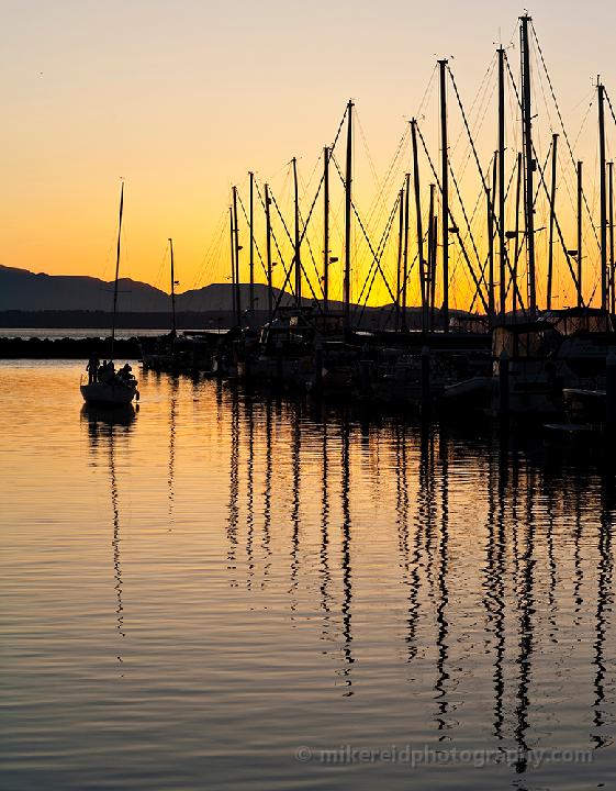 Sailboat returning to Shilshole Bay Marina at sunset in Seattle, with golden sky, silhouetted masts, and calm reflective water glowing in evening light.