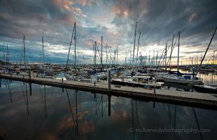 Wide-angle view of Shilshole Bay Marina in Seattle captured at 14mm, showing rows of sailboats and dramatic evening clouds reflected in still water.