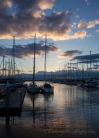 Vertical view of sailboats docked at Shilshole Bay Marina in Seattle with a colorful sunset sky reflected in calm evening water.