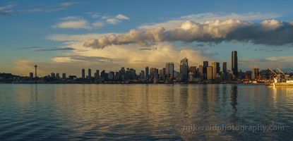 Seattle skyline at golden hour with dramatic clouds and warm evening light reflecting across Elliott Bay, featuring the Space Needle and downtown waterfront.